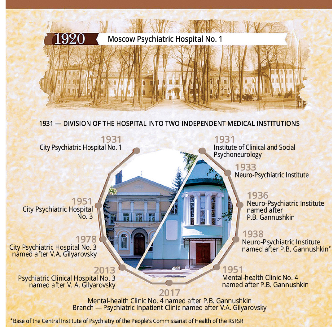 Each page in the history of Preobrazhenskaya Hospital is not only an impressive list of achievements and innovations, but also a unique gallery of distinguished names [3–7]. It served as a basis for the greatest medical luminaries of the time, such as V. F. Sabler, V. R. Butzke, V. A. Gilyarovsky, N. N. Bazhenov, A. V. Snezhnevsky, D. E. Melekhov, T. I. Yudin, S. G. Zhislin, and G. Y. Avrutsky, from which to make their scientific discoveries and validate them in practice; this was also the place where such luminaries of Russian psychiatry as S. S. Korsakov, A. U. Frese, E. K. Krasnushkin, P. E. Snesarev, A. S. Tiganov, and I. Y. Gurovich, and many others, began their medical careers.