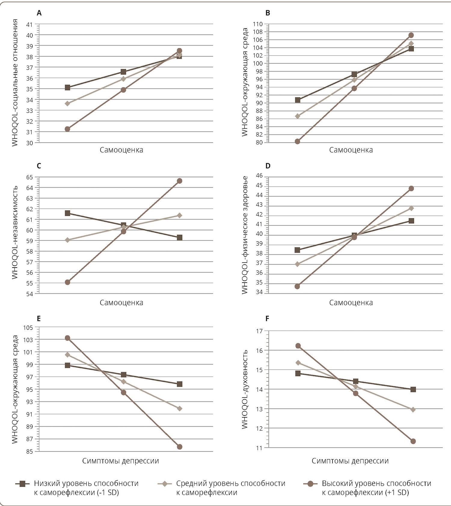 Результаты анализа модерации для саморефлексии в группе пациенток с анорексией представлены в табл. 2. Были обнаружены значимые взаимодействия в моделях модерации, оценивающих взаимосвязь между баллами по шкале RSES и оценками сфер WHOQOL (социальные отношения, физическое здоровье, независимость). В целом было показано, что при высоком уровне способности к саморефлексии более низкая самооценка ассоциирована с ухудшением качества жизни. При низкой способности к саморефлексии эти взаимосвязи становились статистически незначимыми. Показатели Джонсона-Неймана были сходными. Для сферы WHOQOL–социальные отношения значимую связь наблюдали при оценке способности к саморефлексии, равной 3,06 балла или выше (32,5% выборки), а для сферы WHOQOL–физическое здоровье — при оценке, равной 3,13 балла или выше (32,5%). Для сферы WHOQOL–независимость значимую связь наблюдали при оценке способности к саморефлексии, равной 3,63 и более балла (25%). Кроме того, способность к саморефлексии оказывала значимое опосредующее влияние на взаимосвязь между баллом по шкалам RSES и оценкой сферы WHOQOL–окружающая среда. На всех уровнях способности к саморефлексии более низкая самооценка была связана с ухудшением качества жизни, однако эффект был более выраженным, когда способность к саморефлексии была высокой. При использовании процедуры Джонсона-Неймана не было обнаружено статистически значимых точек перехода (графики этих взаимодействий представлены на рис. 1). В моделях, изучающих взаимосвязь между баллами по шкале RSES и оценками сфер WHOQOL–психологическое благополучие или WHOQOL–духовность, не было выявлено значимых взаимодействий.