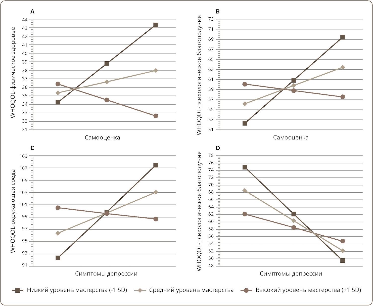 Во-первых, во внимание принимали демографические характеристики и средние баллы в каждой группе. Затем определяли коэффициент корреляции r-Пирсона для оценки связи между двумя переменными, которые включали баллы по подшкалам саморефлексии и мастерства MAS-A, шкалам RSES и BDI, опроснику WHOQOL. Для разработки ряда моделей модерации, которые проводили отдельно для двух групп с разными диагнозами, использовали макрос PROCESS [31] в SPSS версии 29.0. Соответствующий предиктор (т.е. балл по шкалам RSES или BDI), представляющий модератор интереса (т.е. балл по подшкалам саморефлексии или мастерства MAS-A), и взаимодействие между этими переменными вводили в отдельные регрессионные модели, прогнозирующие оценки различных сфер опросника WHOQOL (WHOQOL–психологическое благополучие, WHOQOL–социальные отношения, WHOQOL–физическое здоровье, WHOQOL–независимость, WHOQOL–окружающая среда, WHOQOL–духовность). Наличие опосредующего влияния устанавливали, если взаимодействие было статистически значимым и значимо улучшало регрессионную модель. Значимые взаимодействия визуализировали с помощью методики pick-a-point [32], а для определения значения модераторной переменной (балл по подшкалам саморефлексии или мастерства MAS-A), при котором изменялась значимость связи между баллами по шкалам RSES, BDI и оценками различных сфер опросника WHOQOL, использовали процедуру Джонсона-Неймана [33].