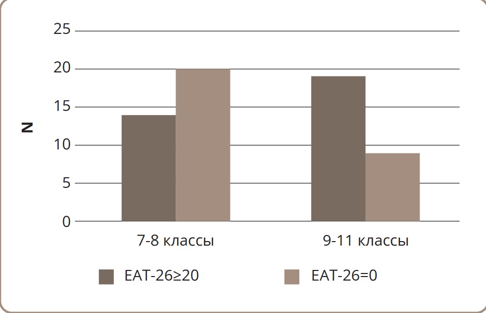 В соответствии с общепринятым критерием отсечения для EAT-26 были выделены группы девушек с высоким (EAT-26≥20) и нулевым (EAT-26=0) суммарным баллом EAT-26. Таблица сопряженности 2x2 была проанализирована с помощью критерия хи-квадрат Пирсона для оценки независимости распределения долей девочек с высоким и нулевым риском РПП в зависимости от возрастной группы (7–8 и 9–11 классы).
