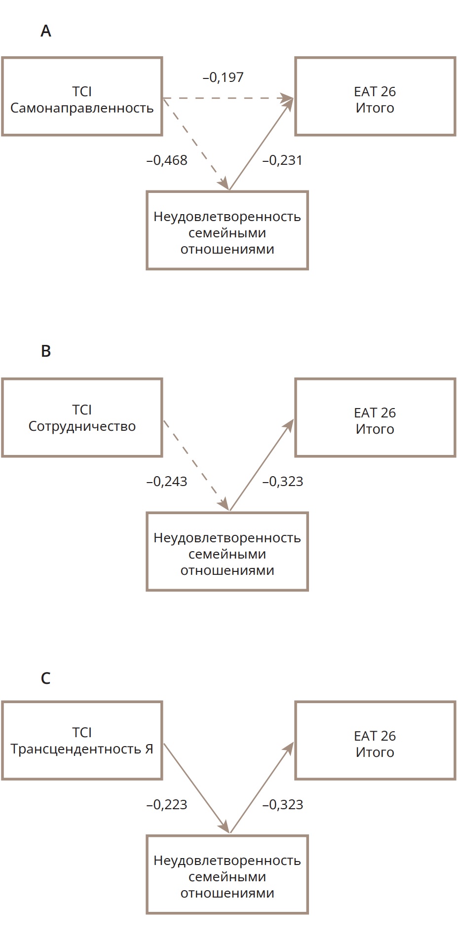 Для выявления значимых медиаций (опосредования влияния независимой переменной на зависимую) применялся путевой анализ с использованием программного обеспечения EQS 6.4. В качестве независимых переменных выступали ИМТ и семь черт темперамента и характера (TCI-R). Суммарный балл EAT-26, полученный с использованием 6-балльной шкалы, рассматривался как зависимая переменная, а неудовлетворенность семейными отношениями — как переменная-медиатор.
