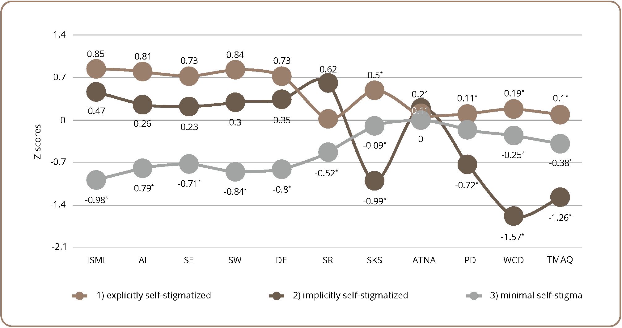 Согласно ANOVA с апостериорными тестами, у 18 пациентов в 1-м кластере (29% выборки) были более высокие уровни общей ИС (dif=0,90, SE=0,089, sig <0,001) из-за более высокого уровня отчуждения (dif=1,20, SE=0,17, sig <0,001), одобрения стереотипов (dif=0,81, SE=0,14, sig <0,001), социальной изоляции (dif=1,09, SE=0,14, sig <0,001) и опыта дискриминации (dif=1,09, SE=0,17, sig <0,001) по сравнению с 25 пациентами из 3-го кластера (40% выборки). Особенности структуры стигмы в 1-м кластере мы определили как «эксплицитную» самостигматизацию.