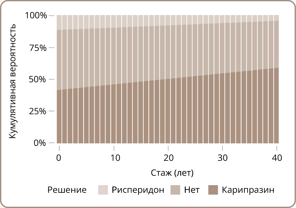 Кроме того, была выполнена проверка гипотезы влияния стажа работы на восприятие разницы в препаратах. Добавление возраста в качестве ковариаты улучшило характеристики модели (AIC 1622,97 против 1624,94). Параметр стажа работы преодолел классический порог статистической значимости (0,01 [0, 00; 0, 02], p=0,047). Также произошла коррекция параметра δ в сторону небольшого уменьшения (0,725). На рис. 2 отражена взаимосвязь стажа работы и вероятности применения карипразина: при увеличении стажа работы эта вероятность растет, тогда как доля ответов «Нет разницы» и «Рисперидон» снижается. Ассоциации между соответствием индивидуального паттерна ответов гипотетической модели и стажем работы обнаружено не было (p=0,870).