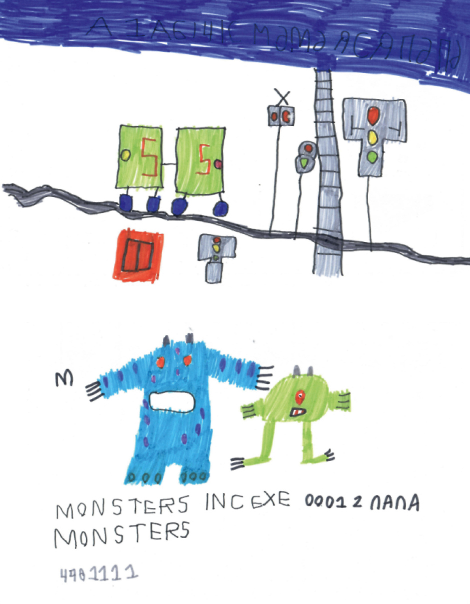 A few months after the start of the therapy, the child’s vocabulary had expanded significantly, a simple phrase had appeared, and speech had begun to be communicative. But the most noticeable result was observed in the emotional dimension and behavior: the child became much calmer, aggression and affective outbursts disappeared, which made it possible to completely discontinue neuroleptics. The dramatic development of cognitive functions was reflected in the child’s drawings (Figures 3, 4). Before therapy, the patient’s drawings had been monotonous and non-objective. Thanks to the development of attention, perception, and fine motor skills, the child began to develop reading and writing skills.