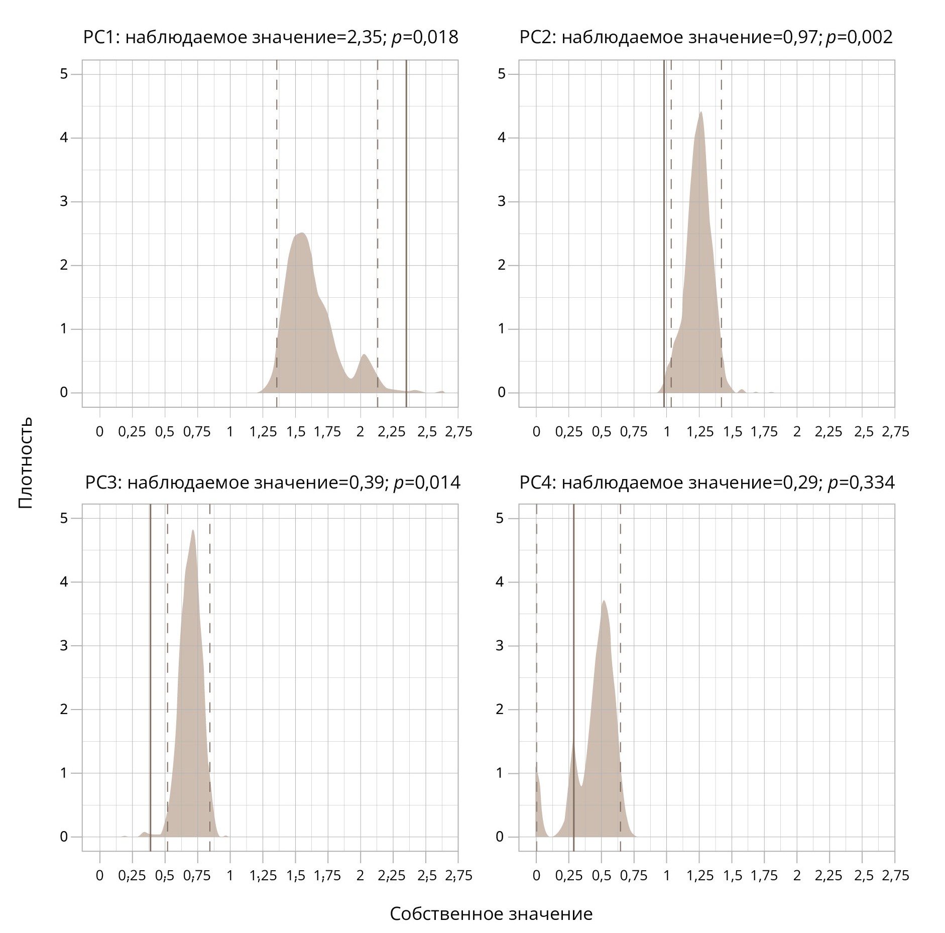 Рисунок 1. Графическое представление сравнения собственных значений с нулевым распределением методом бутстрепа в выборке. Примечание: PC — главная компонента, p — значение p, закрашенная область — нулевое распределение, сплошная линия — наблюдаемое собственное значение, пунктирная линия — 95%-ный доверительный интервал при нулевом распределении.