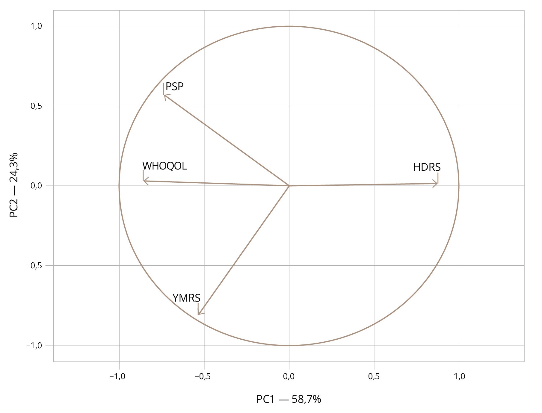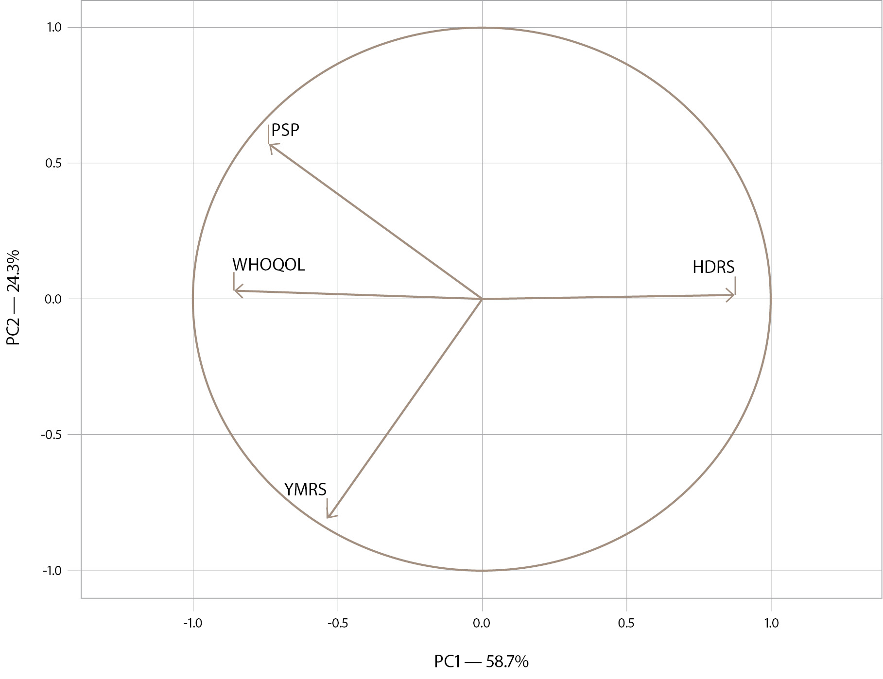 Анализ главных компонент в соответствии с скорректированными переменными представлен на рис. 2. График нагрузки на рис. 2 показывает, что ББ в период ремиссии напрямую связано с тяжестью резидуальных симптомов депрессии (по мере увеличения балла по шкале HDRS социальное функционирование и качество жизни снижаются). И наоборот, наличие резидуальных симптомов мании (по шкале YMRS) связано с меньшим бременем, более высоким социальным функционированием и качеством жизни. Индекс бремени объясняет 58,7% дисперсии данных (ось X).