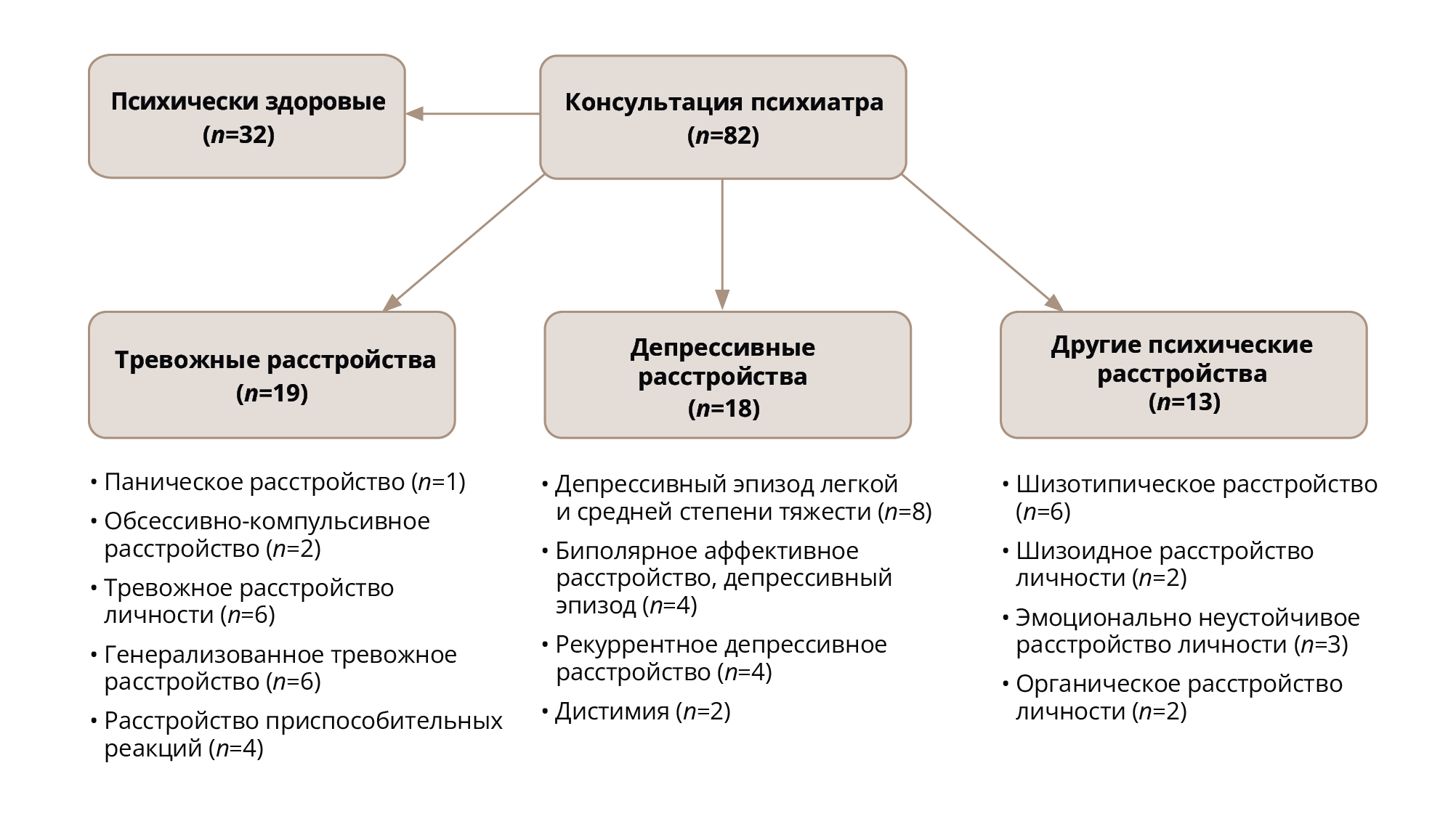 Based on the psychiatrists’ evaluations, among the 82 participants who had undergone consultation, 32 (39%) were deemed mentally healthy. Affective disorders characterized by a predominant depressive syndrome (referred to as “depressive disorders”) were identified in 19 participants (23%). Neurotic disorders with a predominance of anxiety symptoms (“anxiety disorders”) were found in 18 participants (22%), while other mental disorders were diagnosed in 13 participants (16%) (Figure 1).
