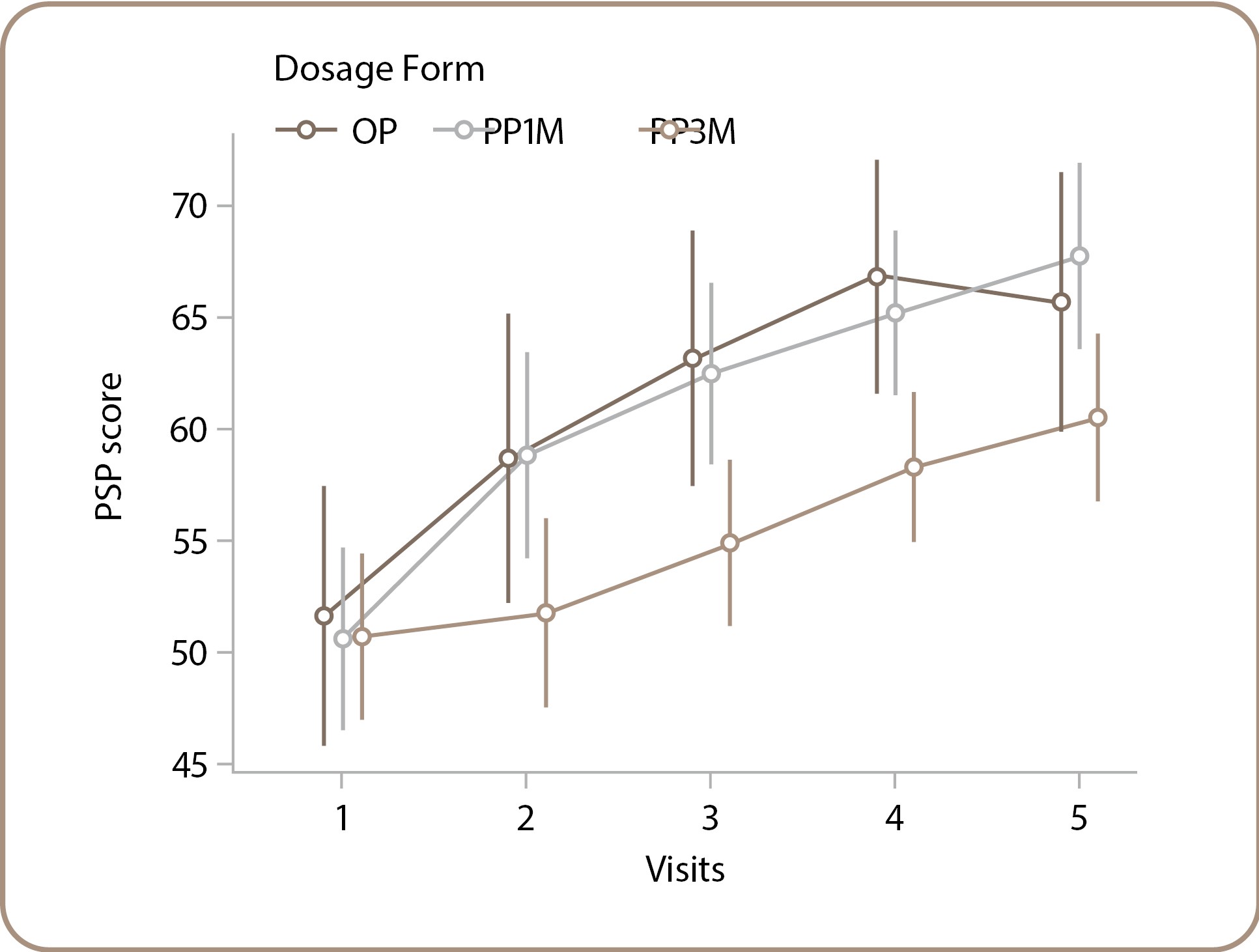AIM: This study was aimed at evaluating changes over time in psychosocial functioning, as well as clinical and psychopathological manifestations, in patients with schizophrenia during early remission and while on therapy with different forms of paliperidone: oral paliperidone (OP), paliperidone palmitate administered once monthly (PP1M), and paliperidone palmitate administered once every three months (PP3M).