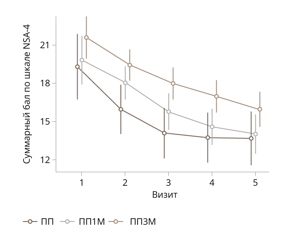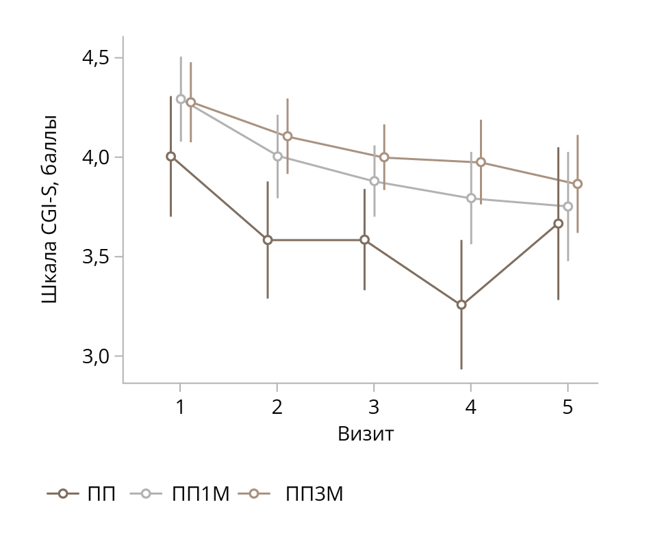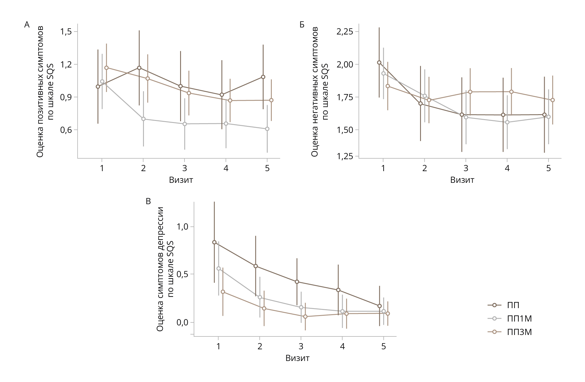 A qualitative determination of psychopathological manifestations and an ordinal assessment of symptom severity were conducted at baseline, before the start of treatment, on Day 1 (Visit 1), and subsequently on days 90 (Visit 2), 180 (Visit 3), 270 (Visit 4), and 360 (Visit 5) of outpatient treatment, with an acceptable interval of ±7 days. Thus, the maximum duration of the observation period for each patient was 360 days (52 weeks or 12 months).