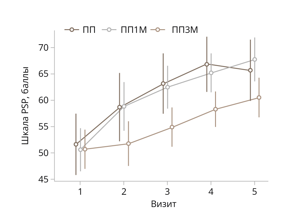 METHODS: The observational study included 155 patients: 54 patients who had been treated with another second-generation antipsychotic received OP, 50 patients who had been treated with another antipsychotic received PP1M injections, and 51 patients who had been in remission for four months after treatment with PP1M received PP3M. The duration of the follow-up period was 12 months. Assessment of personal and social functioning was conducted five times: before the start of treatment, and 3, 6, 9, and 12 months later.