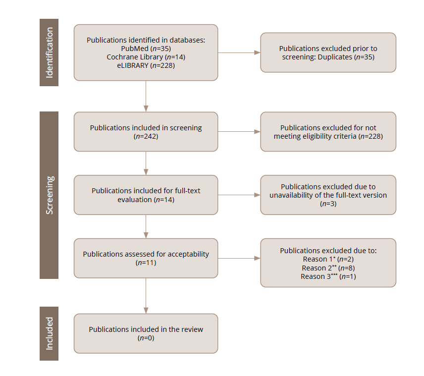 Figure 1. PRISMA flow chart demonstrating the selection process of comorbid depression and alcohol abuse studies. Note: * — insufficient data provided in the article for analysis; ** — diagnosis of the study participants did not meet the eligibility criteria; *** — study type did not meet the eligibility criteria. Source: Klimanova et al., 2024
