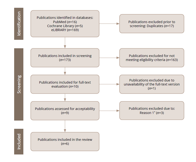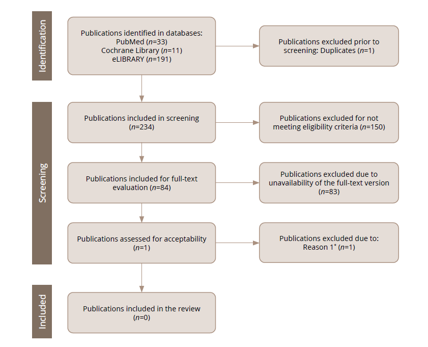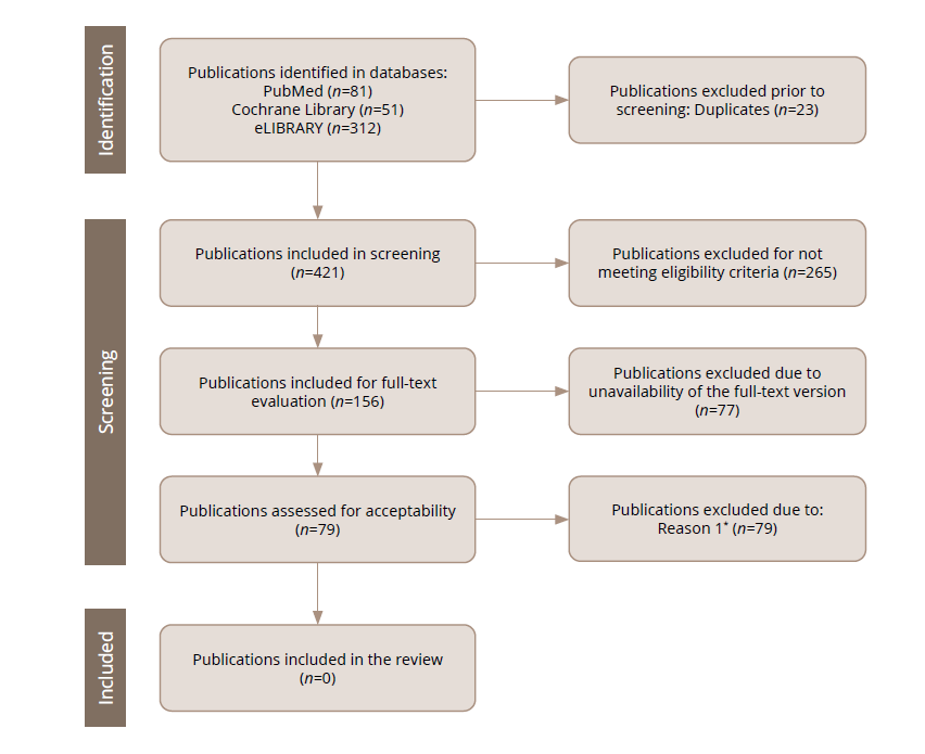 The search for the scientific articles was conducted in the following databases: PubMed, the Cochrane Library, and eLIBRARY. The choice of specific databases, as well as their number, was based on existing recommendations [108–110], as well as their availability to the authors of this study. Subsequently, both forward and backward searches were performed; i.e., searching the bibliographies of selected articles and among articles citing the identified materials. When possible and necessary, full-text versions of the articles were requested from the corresponding authors, as well as potential recommendations for other works related to the review.