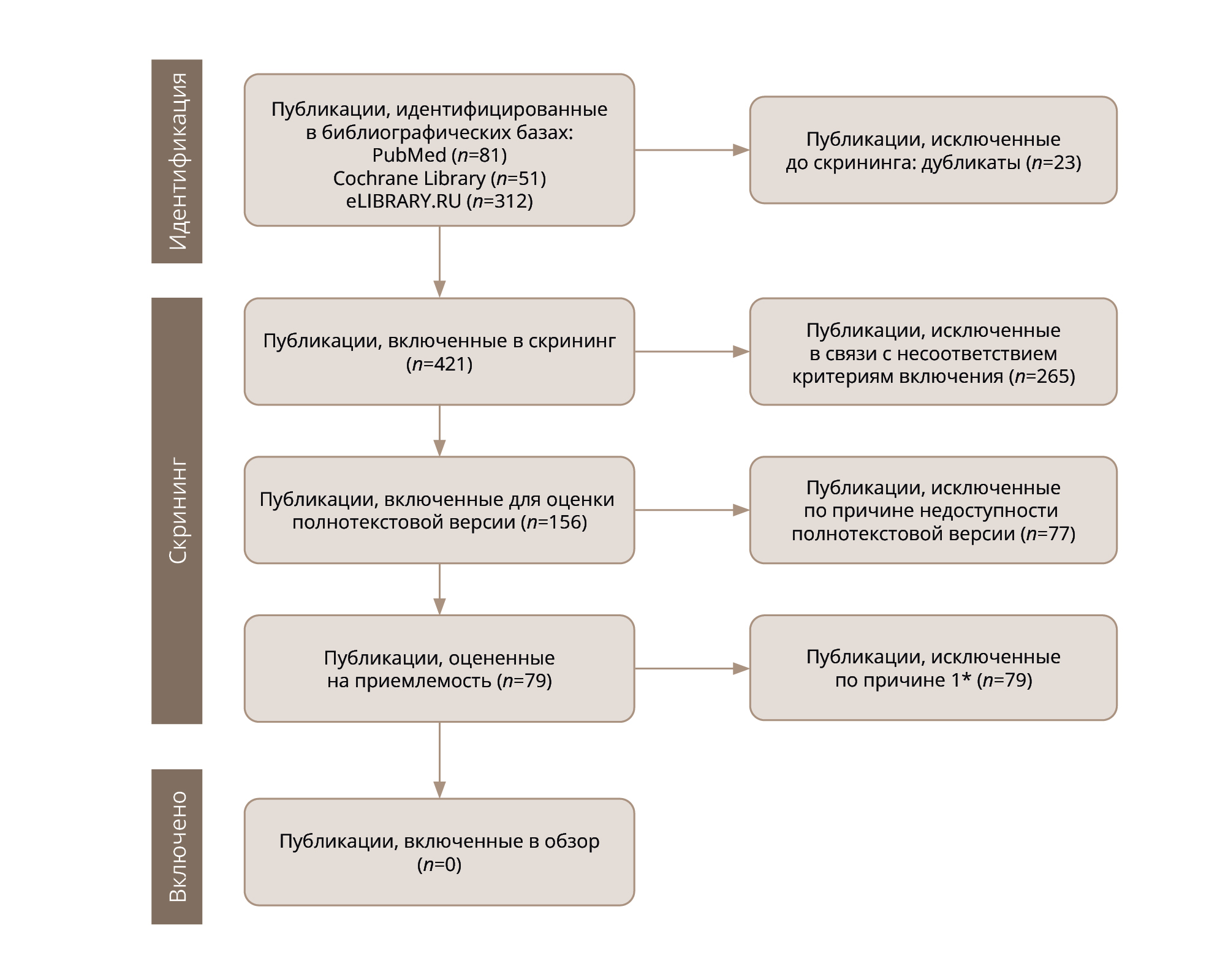 Поиск научных статей осуществлялся в следующих базах научных работ: PubMed, Cochrane Library и еLIBRARY.RU. Выбор конкретной информационно- поисковой системы, а также их количества был сделан на основе имеющихся рекомендаций [108–110] и их доступности авторам исследования. Далее производился прямой и обратный поиск, то есть поиск в библиографических данных отобранных статей и среди статей, ссылающихся на найденные материалы. Когда это было возможно и необходимо, запрашивались полнотекстовые варианты статей у соответствующих авторов, а также возможные рекомендации других работ, относящихся к данному обзору.