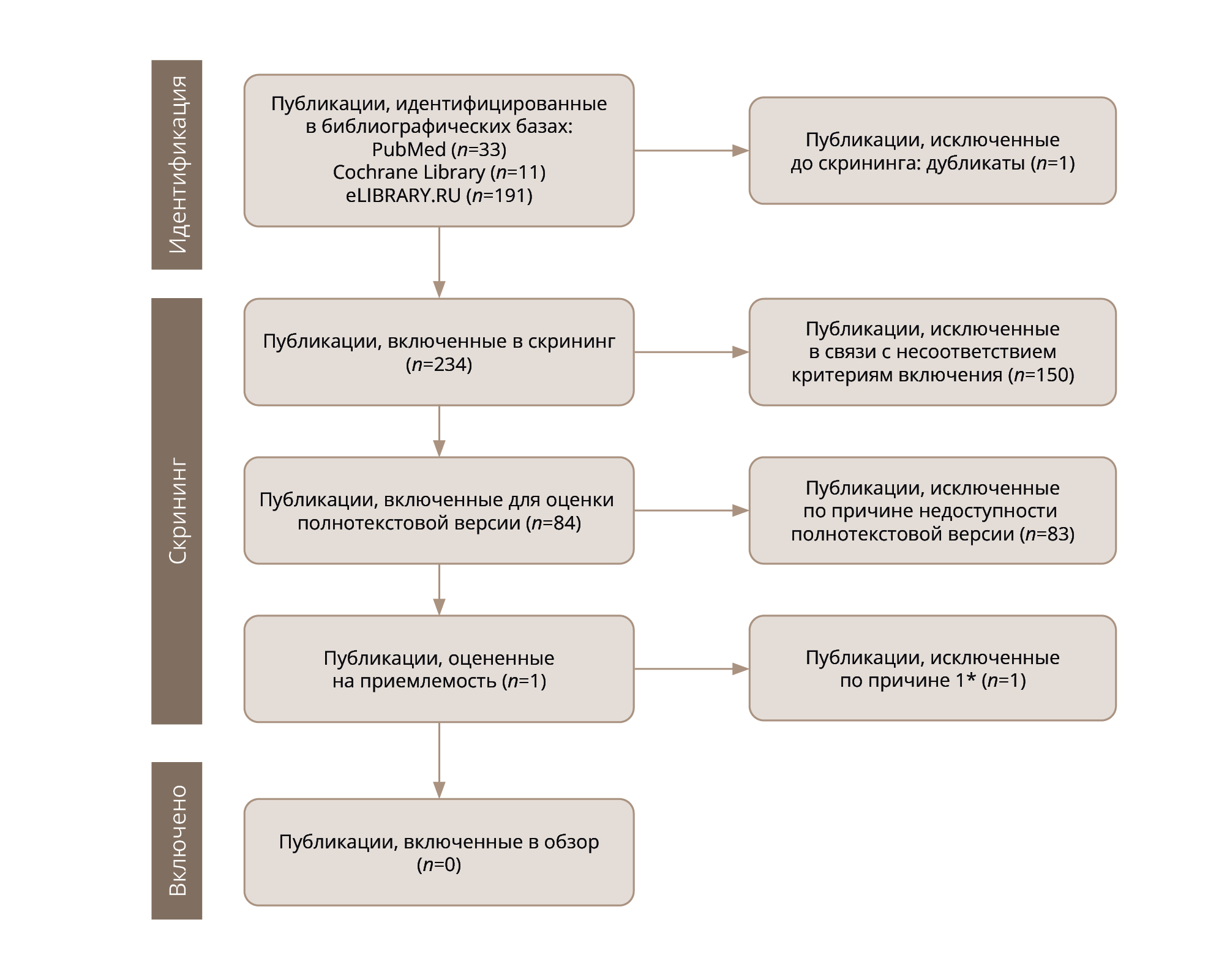 Figure 4. Flow chart demonstrating the selection process of comorbid depression and Parkinson`s disease studies. Note: * — did not meet eligibility criteria (diagnosis, publication type).