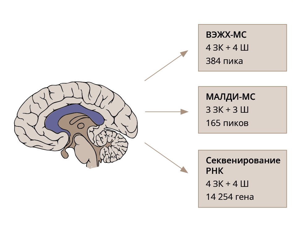 AIM: To study the lipidome and transcriptome composition of the corpus callosum in schizophrenia, including analyzing a larger number of biochemical lipid compounds and their spatial distribution in brain sections, and corpus callosum transcriptome data. To integrate the results of molecular approaches to create a comprehensive molecular perspective of the disease.
