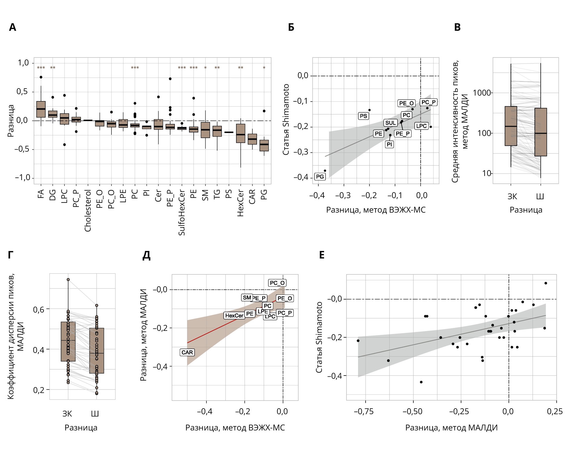 Linear regression lines on the plots B, E, and F are drawn with CI=95% by shaded areas, demonstrating that all the represented correlations are statistically significant and positive. Full names for the lipid classes present in the Box 1 in the Supplementary. The box boundaries in the boxplots represent the 25% and 75% percentiles, the lines represent the spread, and statistical outliers are indicated by dots.