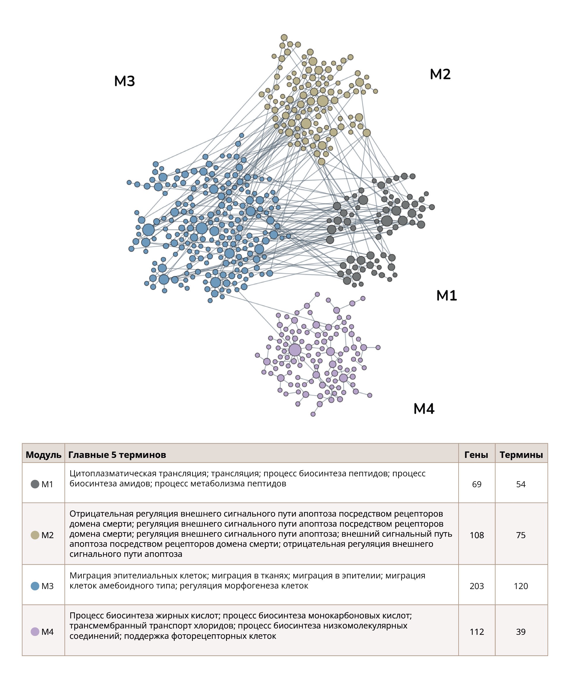 Note: One dot represents one gene, colored according to module assignment, edges represent functional association between two genes, the size of the dots reflects the number of edges. The five most statistically significant functional terms for each module are presented in the Table S5 in the Supplementary.