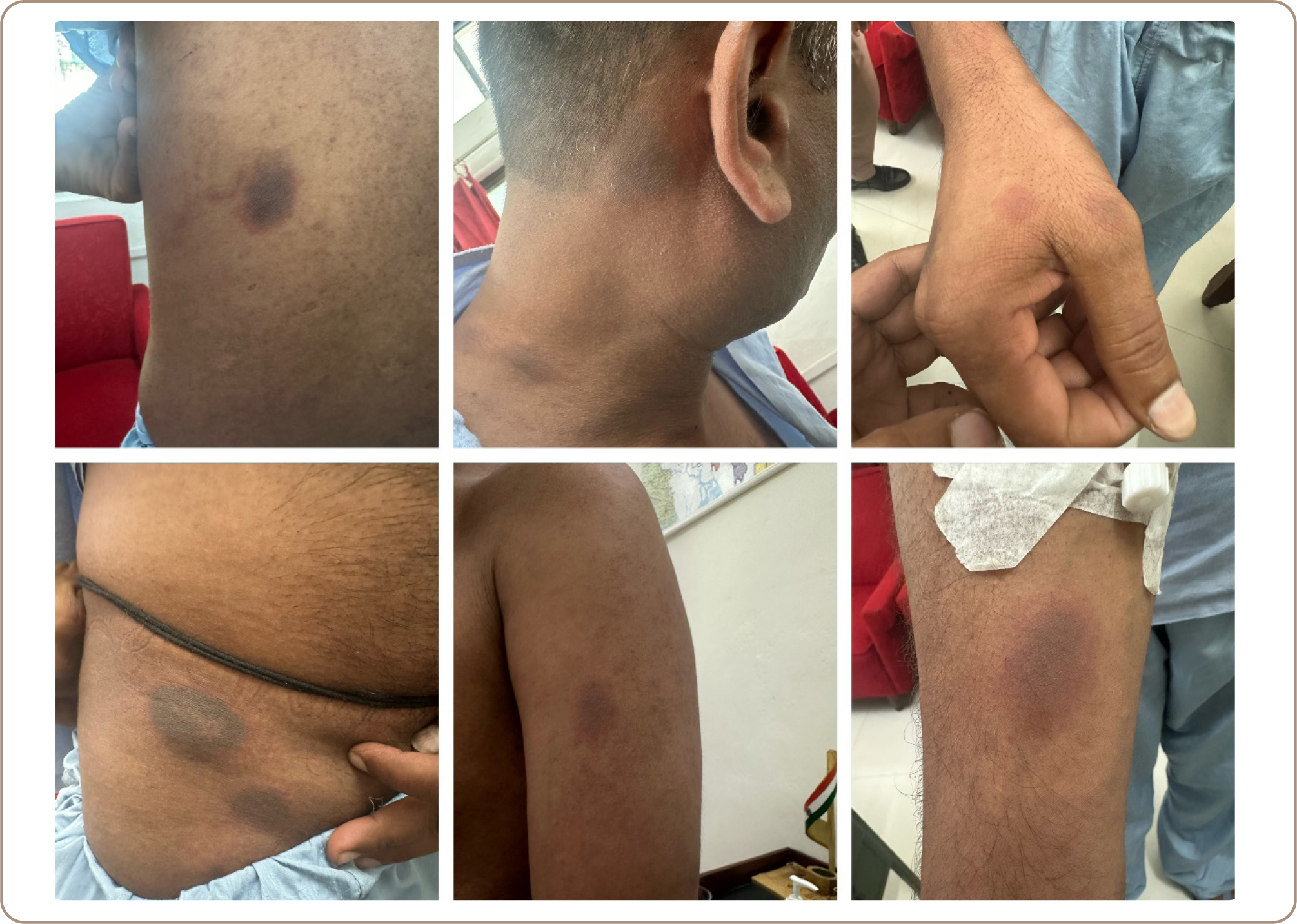 16 July 2024 | — | Lesions resolved gradually over a period of one week, leaving behind dark grey huperpigmented lesions. |