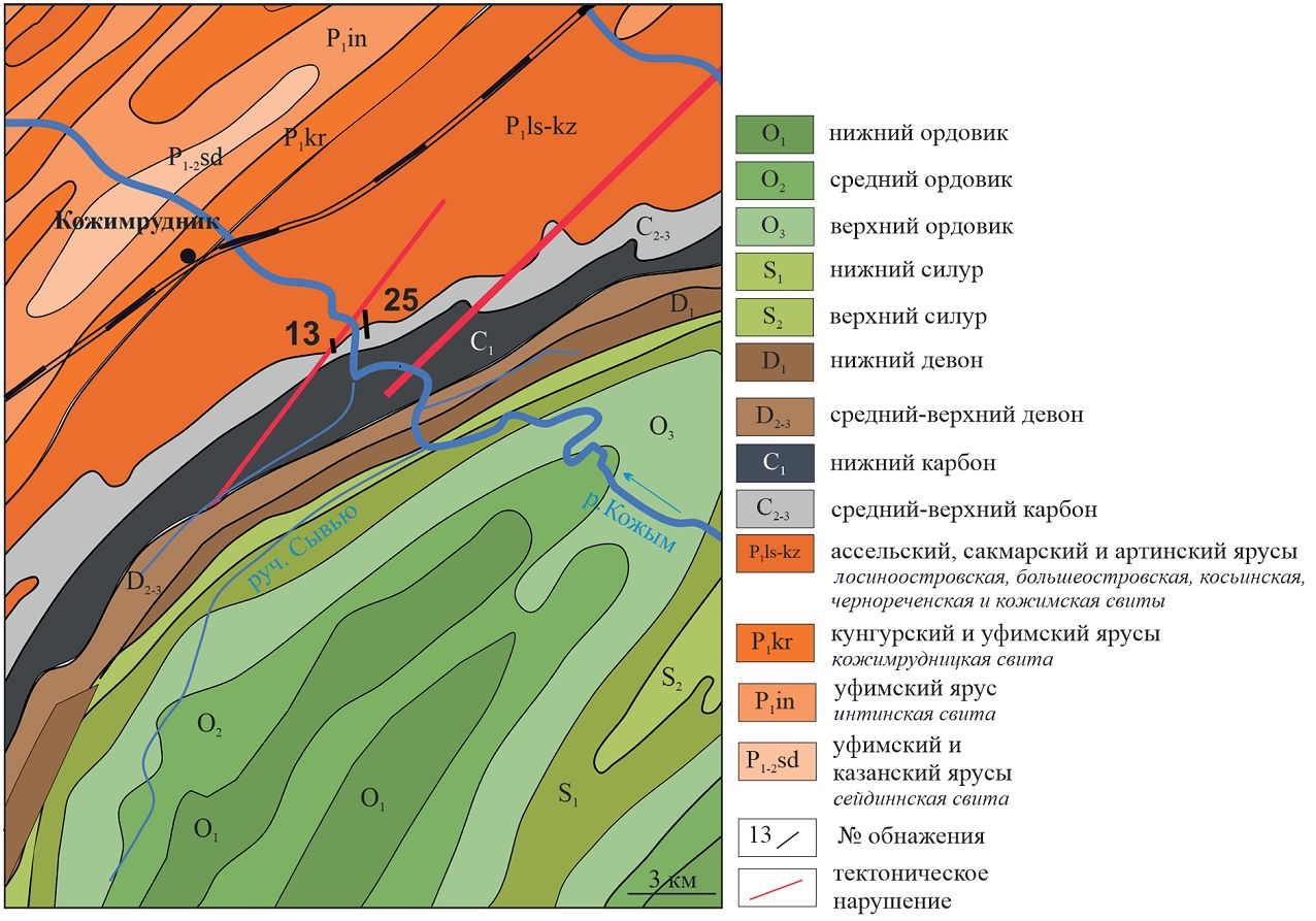 Рис. 1. Местоположение изученного разреза на фрагменте геологической карты района исследований (составлена по материалам А. М. Шишкина, 2000): обн. 13 — лосиноостровская свита; обн. 25 — кожимская органогенная постройка. Номера обнажений по: Антошкина и др., 2010