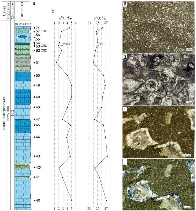 Fig. 2. Lithological–stratigraphic column with the position of the studied samples (а); distribution curves of ä13C and ä18O values (b); types of rocks studied, photographs of thin sections (c–j): c — peloid–micritic limestone, sample 39; d — bioclastic limestone of the lower subformation, sample 26; e, f — secondary silicytolite, sample 14 (е — without analyzer, f — with analyzer); g — silty-argillaceous limestone, sample 52; h — bioclastic limestone of the upper subformation, sample 48; i–j — siliceous- carbonate- argillaceous mixtolit, sample 51 (i — without analyzer, j — with analyzer)