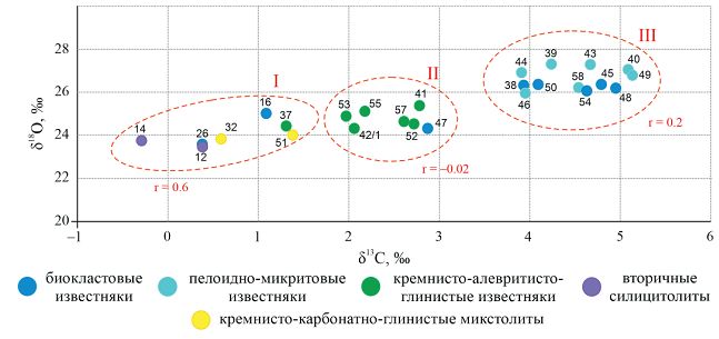 Обособление кластеров на диаграмме ä13C–ä18O выявляет закономерную природу для изученных пород: I кластер — наиболее окремненные породы; II — известняки, обогащенные терригенной примесью; III — относительно «чистые» биокластовые и пелоидно-микритовые известняки.