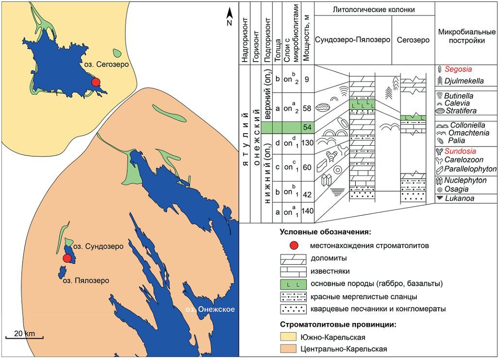 Исследования проведены в центре коллективного пользования Института КарНЦ РАН Петрозаводска. Обширный палеонтологический материал был собран исследователями в 1950–1980-х годах. Материалом для настоящего исследования послужили образцы строматолитов из коллекции Р. В. Бутина и В. В. Макарихина, отобранные из отложений онежского горизонта ятулия в районе озер Сегозеро (Центрально-Карельская строматолитовая провинция) и Сундозеро (Южно-Карельская строматолитовая провинция) (рис. 1). Верхний и нижний подгоризонты разделяет толща, состоящая из основных пород. Выходы пород ятулийского надгоризонта соответствуют по возрасту концу глобального Гуронского оледенения (2.1 млрд лет). Образцы хранятся в музее геологии, а также лаборатории геологии и геодинамики докембрия ИГ КарНЦ РАН.