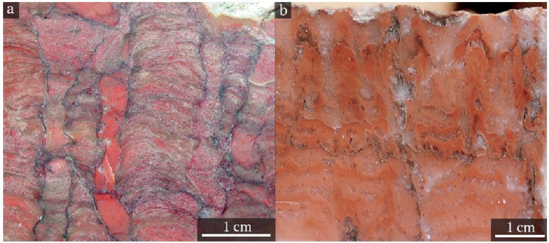 Рис. 2. Фотографии пришлифовок строматолитов: a — Sundosia mira, b — Segosia columnaris