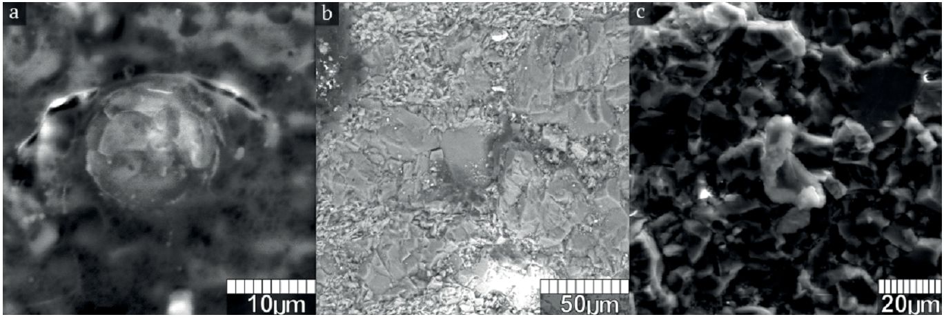 Рис. 3. Микроструктуры в палеопротерозойских строматолитах: a, c — сферические углеродистые структуры в Segosia columnaris; b — изогнутая структура в Sundosia mira (детекторы обратноотражённых и вторичных электронов)
