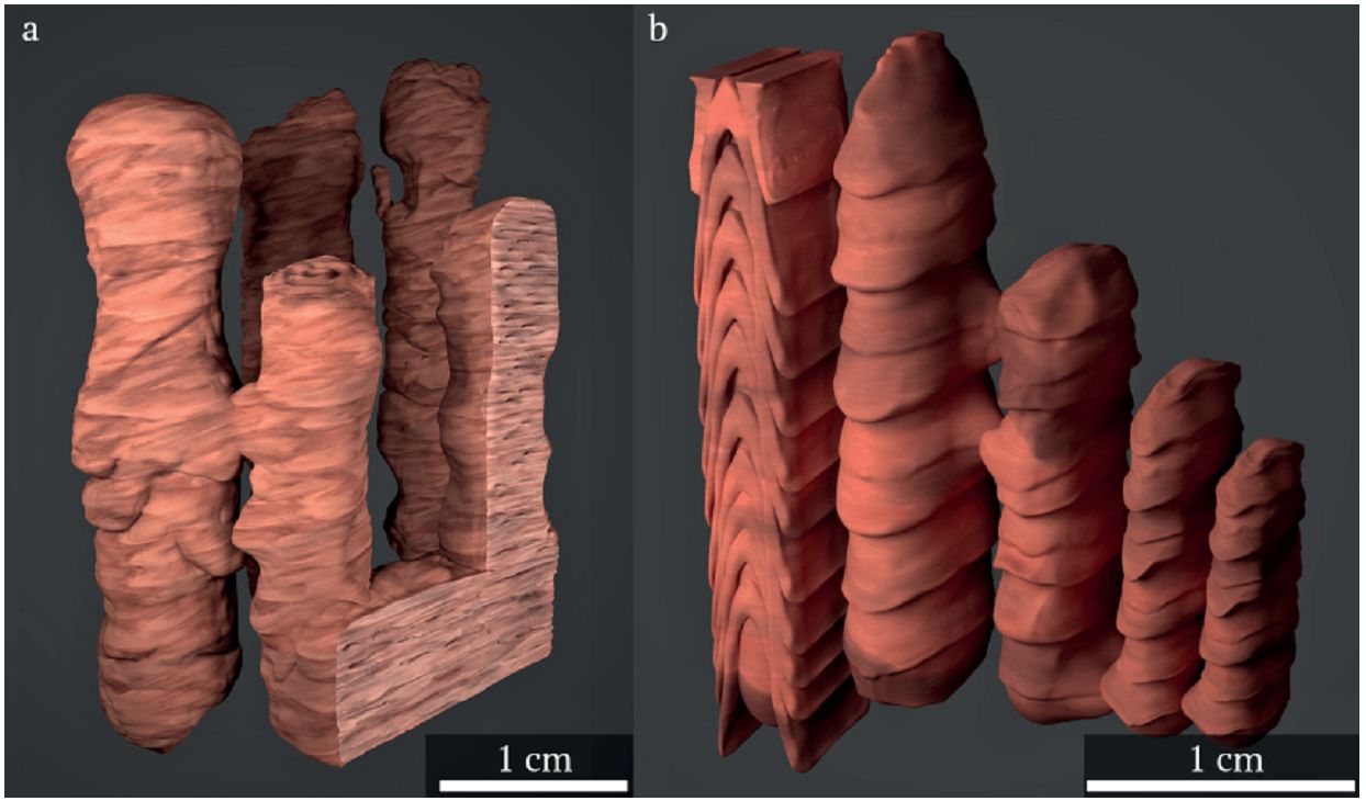 Рис. 4. 3D-модели палеопротерозойских строматолитов cо срезом, созданные с помощью программы Blender: a — Sundosia mira, b — Segosia columnaris