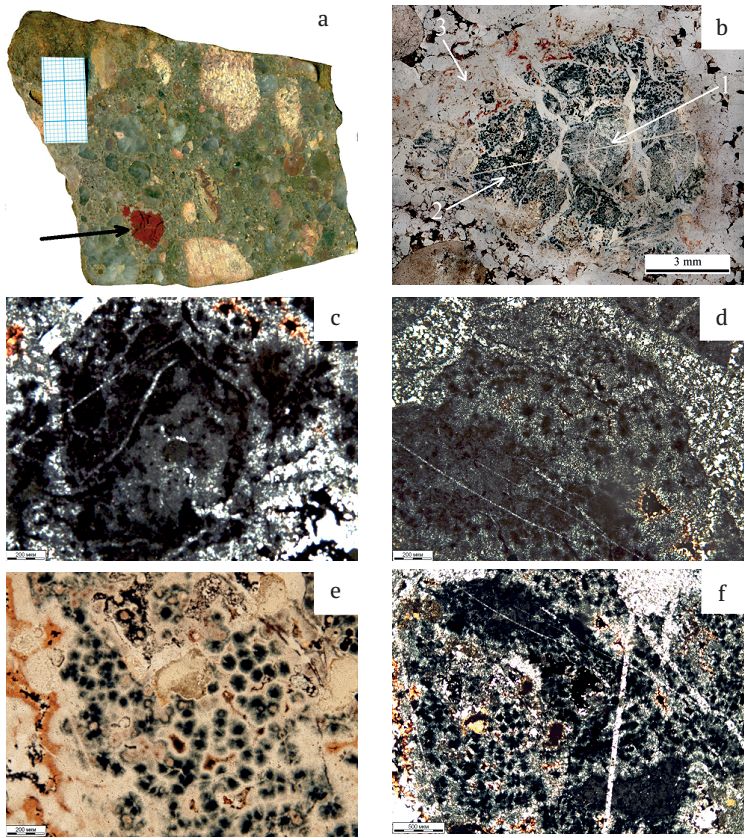 3. Fig. 2. Jasper pebbles in gravelite, sample Д-1: a — polished sample; b — zonal structure; c — an inner part (zone 1 in Fig. 2 b) composed of devitrified volcanic glass; d — an area with an oolitic structure (zone 2 in Fig.2 b) and an external non-pigmented zone (zone 3 in Fig. 2 b); e — oolitic structure and crostification rim (zones 2 and 3 in Fig. 2 b); f — microcracks. Photos c, d, e — nikols are crossed; b, d — in passing light
