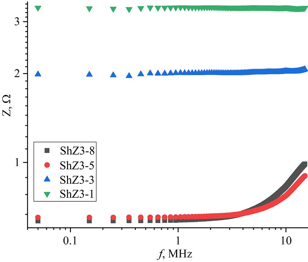На рис. 1 приведены частотные зависимости полного сопротивления (импеданса) Z образцов Зажогинского месторождения ShZ3, имеющих разную толщину. Импеданс включает в себя сумму активного (омического) сопротивления R, которое, как правило, не зависит от частоты переменного тока, и реактивного сопротивления, которое зависит от частоты тока. Реактивное сопротивление складывается из ёмкостного, связанного с ёмкостью C и уменьшающегося с ростом частоты тока, и индуктивного, определяемого индуктивностью L и увеличивающегося с ростом частоты тока.