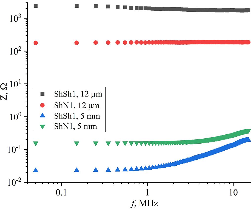 Результаты показывают, что при уменьшении толщины шунгитовых пластин происходит значительное увеличение импеданса. Если при толщине 500 и 800 мкм вид частотной зависимости (пологий участок в диапазоне частот 0.1–2 МГц со значительным подъемом при дальнейшем росте частоты) и значение импеданса (~ 0.7 Ом) практически одинаковы, то при уменьшении толщины пластины до 300 мкм величина импеданса на пологом участке растет в 3–4 раза, а загиб становится едва заметным и смещается в сторону больших частот (около 10 МГц по сравнению с 2–3 МГц для образцов ShZ3_5 и ShZ3_8). При толщине пластины 100 мкм величина импеданса еще больше растет (до 3.3 Ом), а зависимость становится прямолинейной во всем измеренном диапазоне частот.