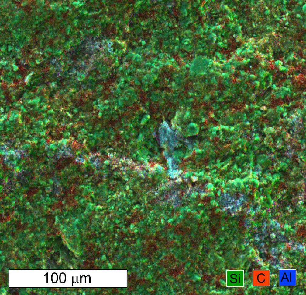 Fig. 4. A typical example of the distribution of quartz microcrystals (green) and aluminosilicates (blue) in the carbon (red) matrix of ShZ3 shungite. Selective elemental contrast of the scanning electron microscopy image