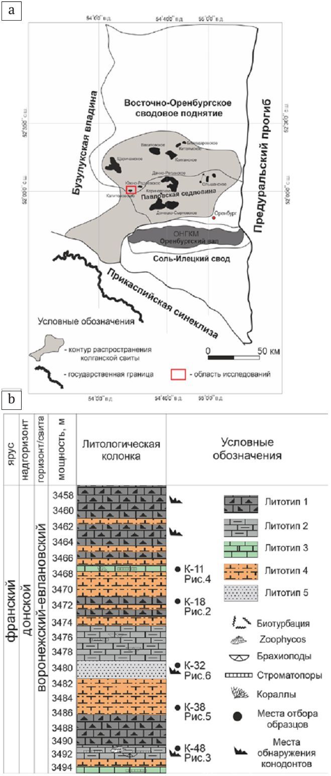 Рис.1. Контур распространения колганской свиты (a). На схеме отображено положение нефтяных месторождений (черные пятна), где отложения колганской свиты являются коллектором (Оренбургский…, 2013). Литологостратиграфическая колонка изученного интервала скважины колганской свиты (b). ОНГКМ — Оренбургское нефтегазоконденсатное месторождение
