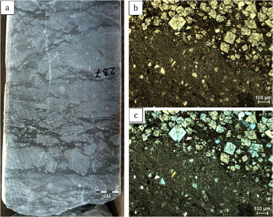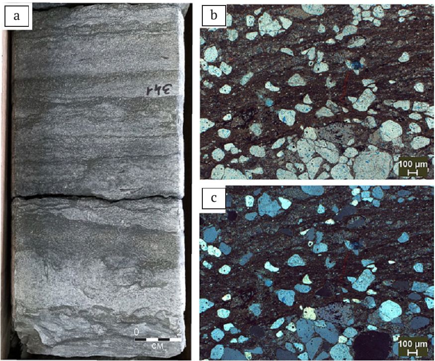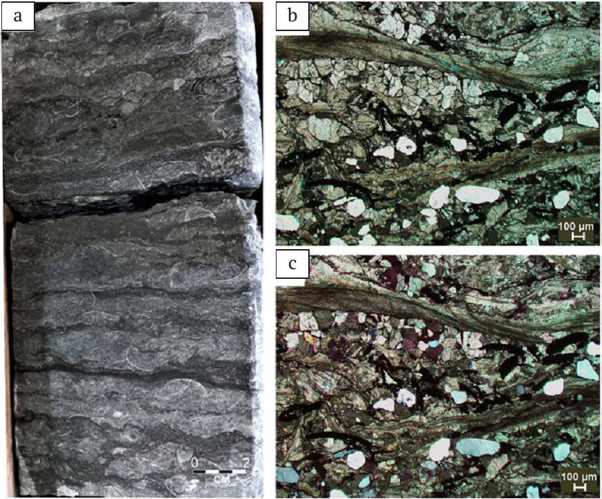 Рис. 5. Известняк песчанистый ритмичнослоистый: a — фрагмент кернового материала; b — известняк песчанисто-глинистый с кварцевыми зернами в неяснослоистом глинисто-микрокристаллическом матриксе (шлиф, николи //); c — то же (николи +)