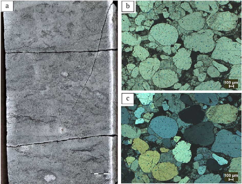 Рис. 6. Песчаник кварцевый, пятнисто-слоистый: a — фрагмент кернового материала; b — песчаник кварцевый средне- и мелкозернистый, с кальцитовым цементом (шлиф, николи //); c — то же (николи +)