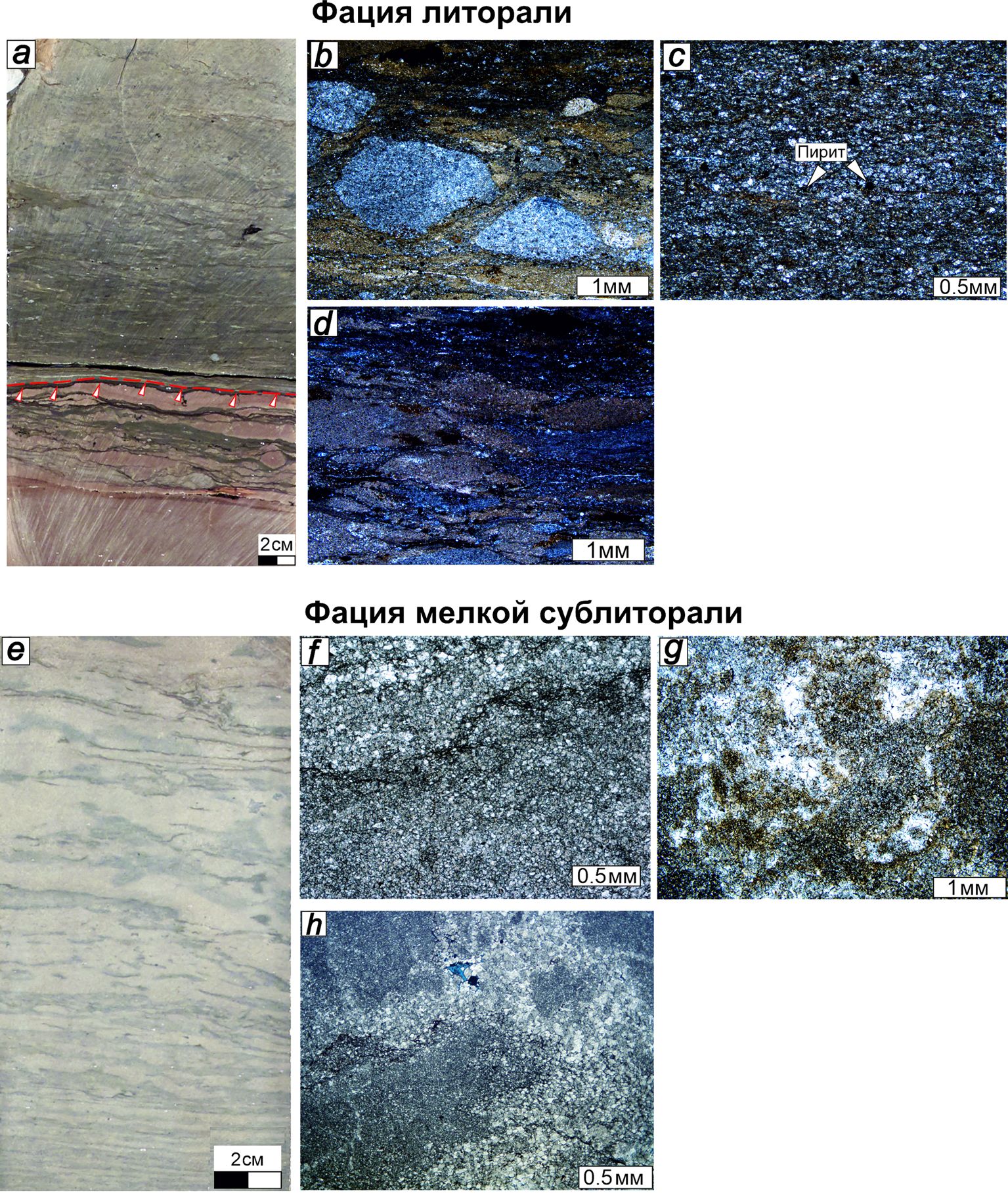 Фация мелкой сублиторали представлена серыми микрокристаллическими доломитами с теневой структурой мадстоун, с реликтовыми органогенными структурами, частыми глинистыми прожилками. Породы формировались в нормально-морских условиях со спокойной гидродинамикой (рис. 3, e—h).
