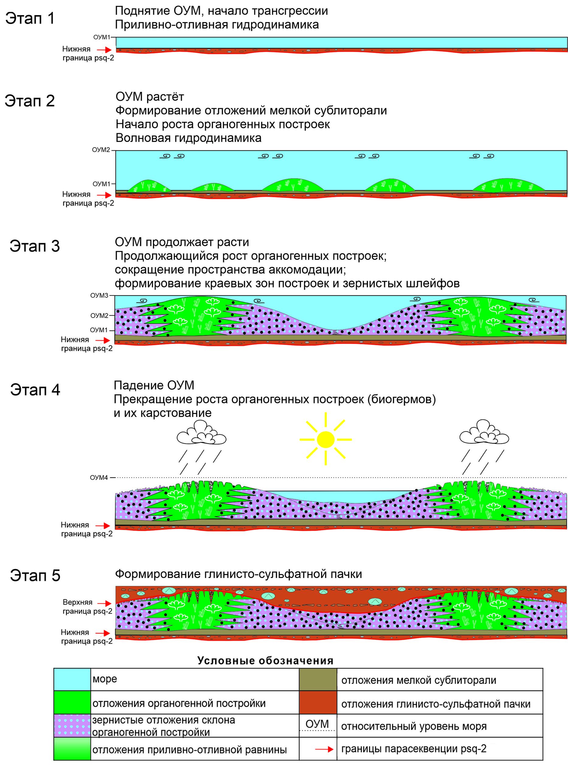 При каждом следующем кратковременном повышении ОУМ постройки латерально смещаются (при благоприятных условиях в определенных участках рельефа, сформированного зернистым материалом, начинается рост новых построек). На заключительном этапе седиментации в период падения ОУМ постройки выводятся в зону субаэральной экспозиции, где подвергаются карстованию. На этом этапе формируются доломитовые разнообломочные брекчии элювиального горизонта. Фиксируется верхняя граница парасеквенции и начало нового парасеквенса — psq-3, где образуются неравномерно сульфатизированные глинистые доломиты литорали, являющиеся покрышкой пласта Б5.