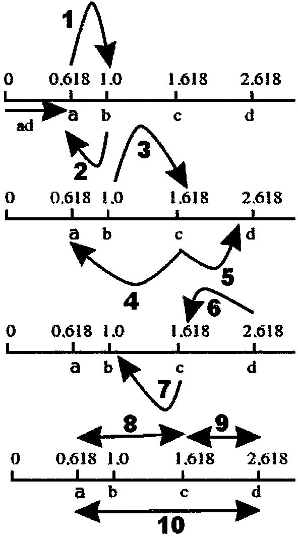 Предельные значения золотых пропорций систем (подсистем) в крайних отношениях могут определяться числами 0.618, 1.618, 2.618. Из них число 1.618 называется золотым числом Ф1 в честь древнегреческого скульптора и архитектора Фидия. Выводимость числа Ф также вытекает из числового рекурсивного ряда последовательности Фибоначчи (Fibonacci Liber Abaci, 2002). А важнейшим свойством указанных чисел, характеризующих состояние параметров самоорганизующихся систем и подсистем, является их выводимость одного из другого (рис. 1).