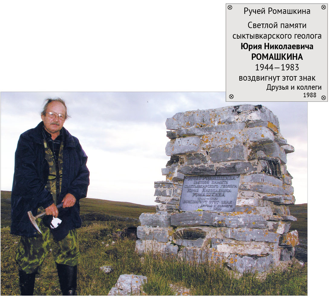На одном из левых притоков р. Песчаной на Пай-Хое, над ущельем, в детально исследованных Ю. Н. Ромашкиным флюоритоносных каменноугольных известняках отрядом сотрудника Института геологии к. г.-м. н. А. А. Беляева (1951—2004) в 1988 г. был установлен памятный знак (Юшкин, 1998).