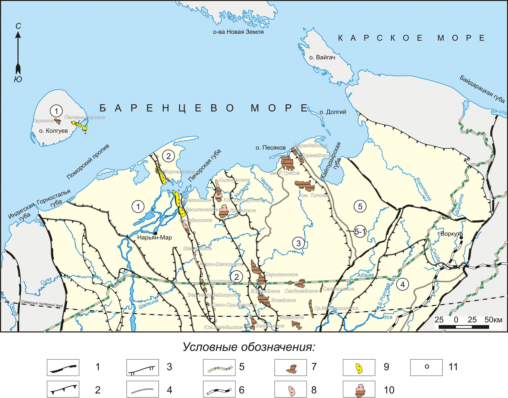 Границы структур: 1 — крупнейших, надпорядковых; 2 — крупных, первого порядка; 3 — средних, второго порядка; 4 — границы нефтегазоносных районов; 5 — административная граница между Республикой Коми и НАО; 6 — железная дорога; 7—10 — месторождения: 7 — нефтяные, 8 — газоконденсатные, 9 — газовые, 10 — нефтегазоконденсатные. Элементы нефтегазогеологического районирования: 1 — Малоземельско-Колгуевская НГО, 2 — Печоро-Колвинская НГО, 3 — Хорейверская НГО, 4 — Косью-Роговская НГО, 5 — Варандей-Адзьвинская НГО, 5-1 — вал Сорокина