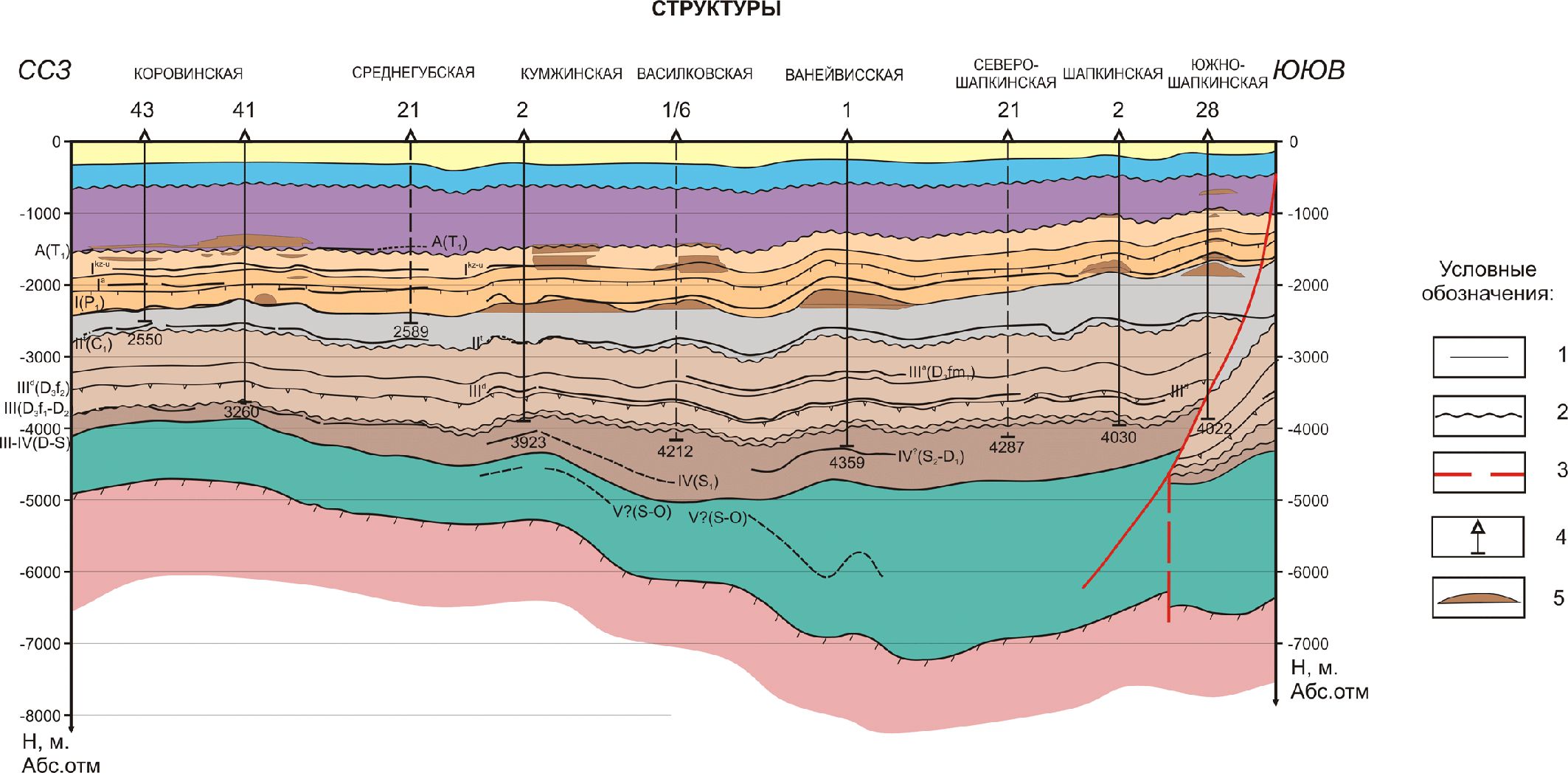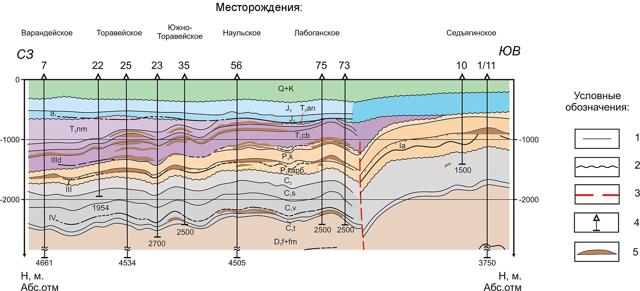1 — границы стратиграфических комплексов, 2 — поверхности несогласий, 3 — разрывные нарушения, 4 — скважины, 5 — месторождения нефти и газа (Тимано-Печорский…, 2002)