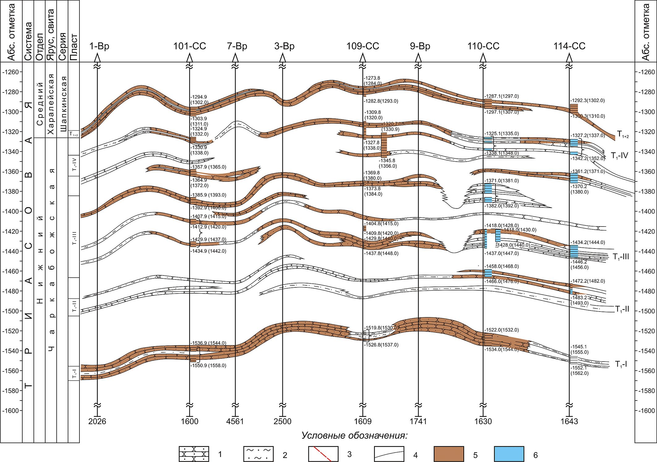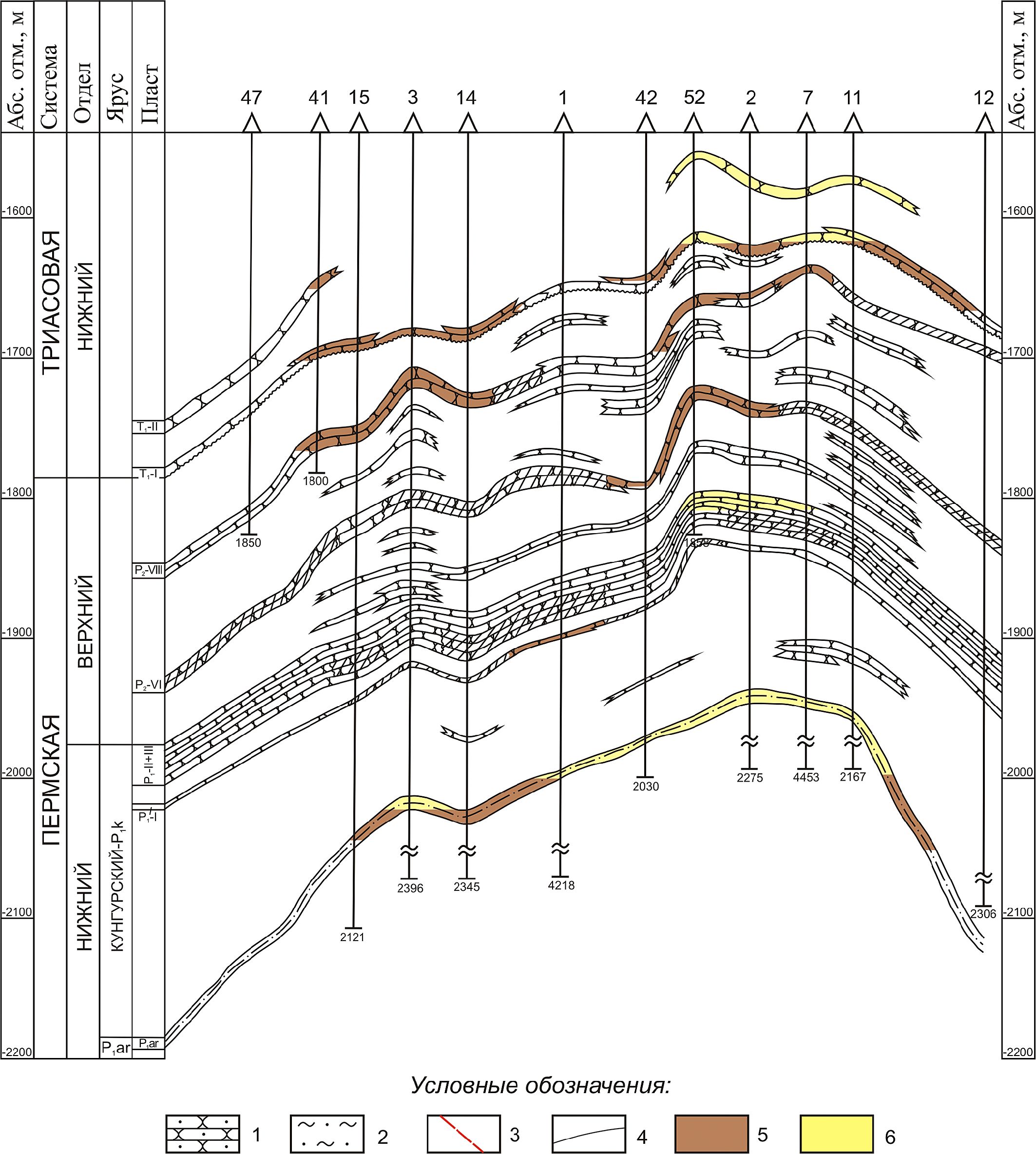 1 — песчаники, 2 — алевролиты и аргиллиты, 3 — тектонические нарушения, 4 — границы пластов, 5 — нефть, 6 — газ (Природные…, 2011)