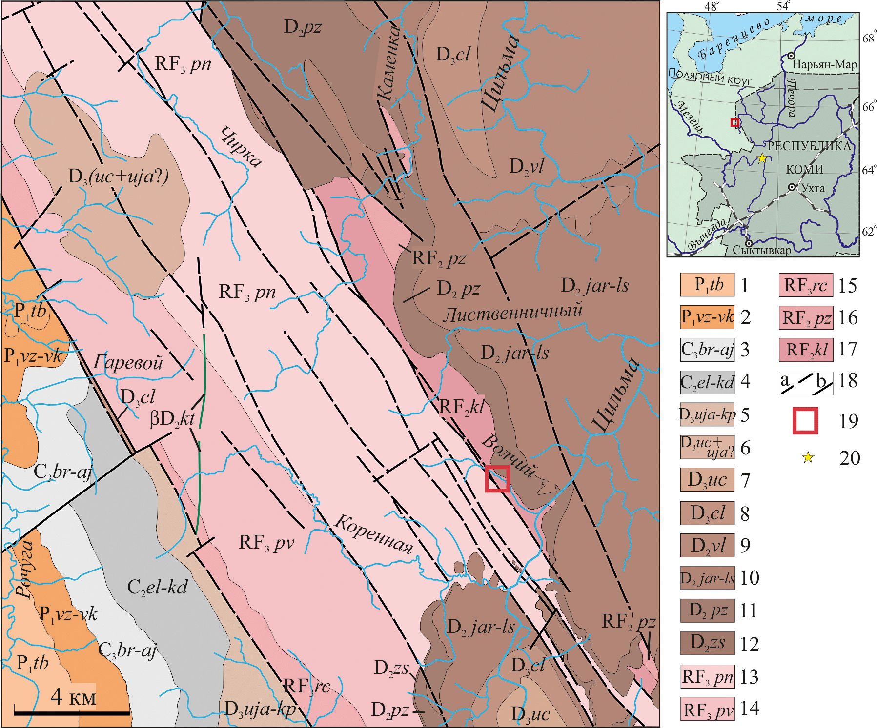 8 — Tsilemskaya suite — interbedding of clays, mudstones, siltstones, sandstones; 9 — Valsovskaya suite — tuffs, tuffites, tuff sandstones, tuff mudstones, interlayers of siltstones, sandstones, mudstones, basalts; 10 — Yaranskaya and listvenichnaya formations, undivided — quartz sandstones, layers and lenses of small pebble conglomerates, interbedded siltstones, clays and sandstones; 11 — Pizhemskaya suite — quartz sandstones, interlayers of gravelstones, siltstones and mudstones; 12 — Zaostrovskaya formation — siltstones, mudstones, sandstones; 13 — Paunskaya suite — clayey limestones, silty shales with interlayers of dolomites, limestones, sandstones, quartzite sandstones, shales, dolomites, strata of carbonaceous shales and shale-quartzite sandstones; 14 — Pavyugskaya suite — dolomites; 15 — Rochugskaya formation — clayey shales with interlayers of siltstones, dolomites, sericite-quartz and sericite-chlorite shales; 16 — Pizhemskaya formation — shales; 17 — Kleonovskaya formation — mica quartzite sandstones and quartzite-like siltstones, interbedded quartz-mica shales and siltstones; 18 — discontinuity faults (a — suspected, b — reliable); 19 — work area; 20 — diamond-gold-rare metal paleo placer Ichetyu