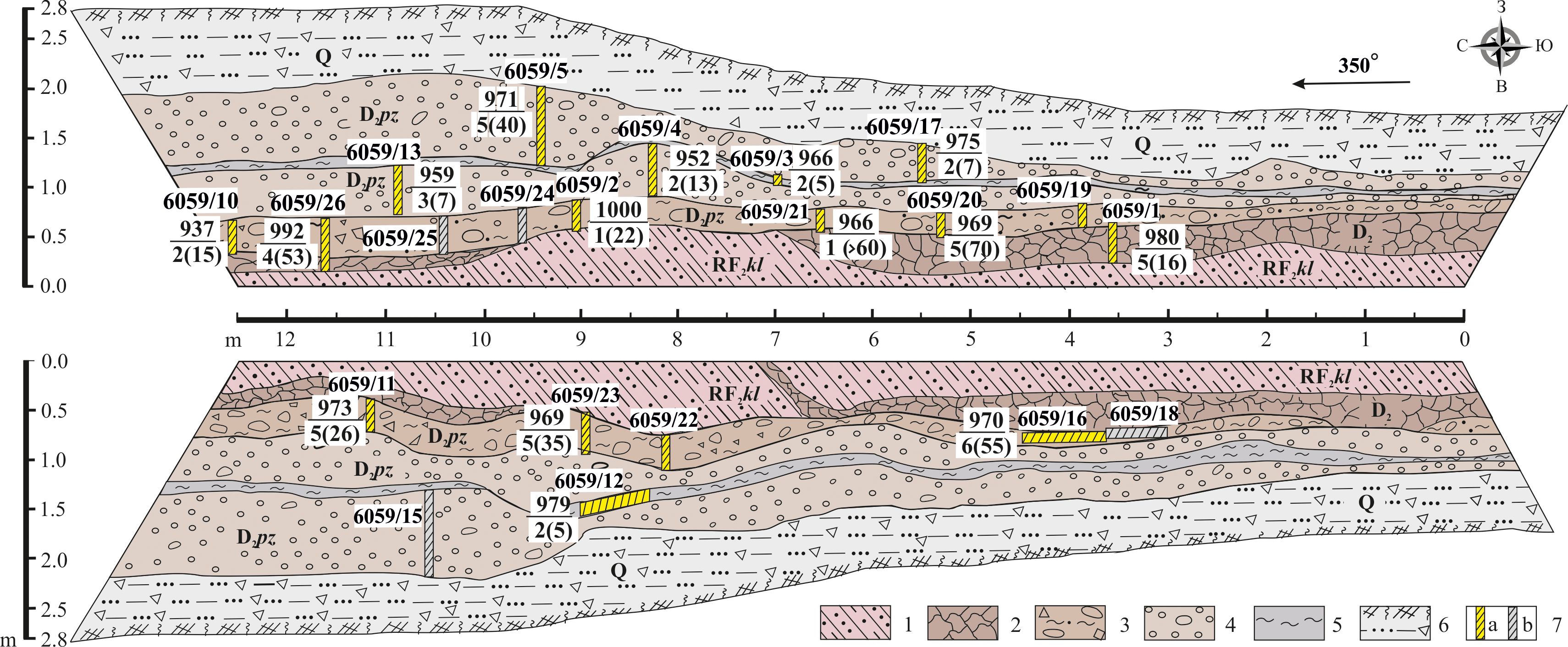 Fig. 2. Schematic cross-section of the trench. Riphean rocks: 1 — alternating metasandstones and meta-siltstones (layer 1). Devonian deposits (2—5): 2 — red clay with fragments of meta-siltstones (layer 2); 3 — pebbles, boulders, blocks and crushed rock of vein quartz, cemented by loam (layer 3); 4 — quartz gravel (layer 4, 6); 5 — loam (layer 5). Quaternary deposits: 6 — soil and plant layer with crushed rock and gruss of metasandstones, meta-siltstones, shales, mainly of Riphean age with sandy loam filler (layer 7). 7 — sampling intervals with established gold (a) and empty (b). The numbers in the numerator indicate the average fineness of gold (‰), in the denominator — the number of studied particles, in brackets — the total number of signs of gold. The fineness of gold was determined in the center of the particles