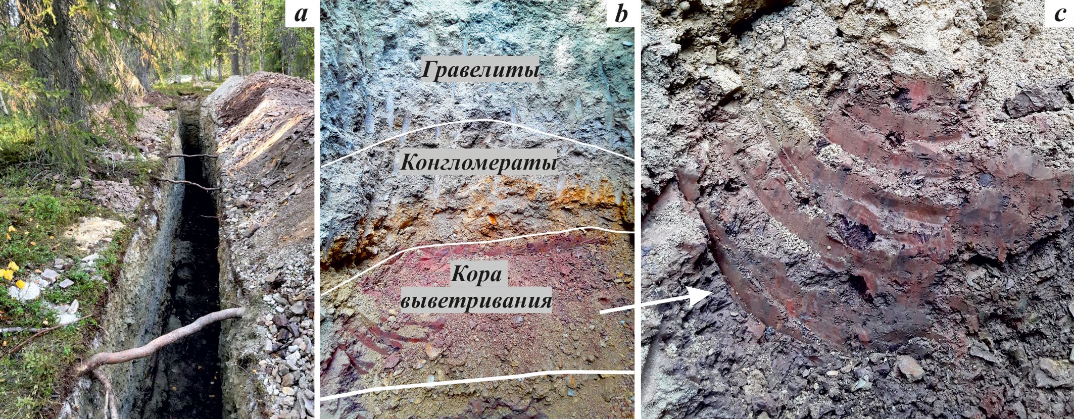 Рис. 3. Канава (а), вскрытый в ней межформационный контакт рифейских и девонских отложений (b) и кора выветривания (с)
