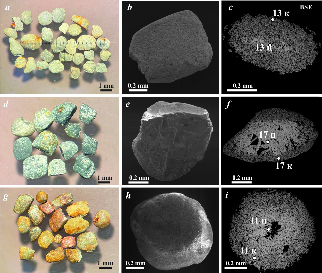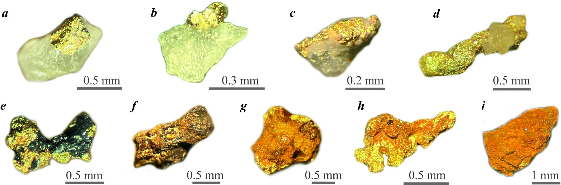 Золото наблюдается в сростках с кварцем (рис. 9, а—d). Их доля составляет примерно 10 %. Встречаются золотинки, на поверхности которых установлены мусковит, сидерит и гидроксиды железа (рис. 9, e—i). Отмечаются частицы, полностью заключенные в «рубашку» гидроксидов железа.
