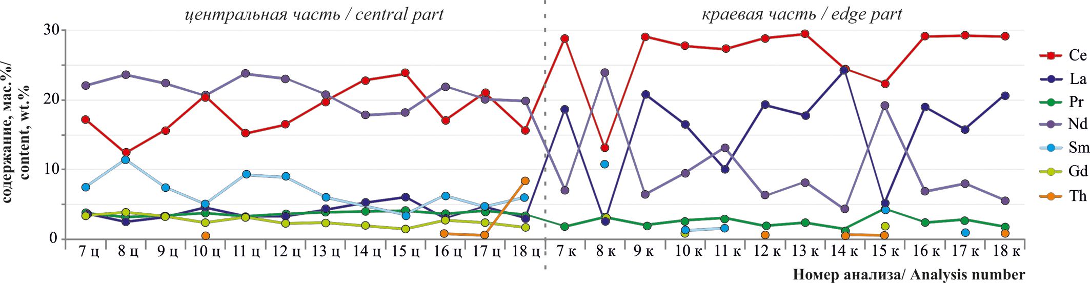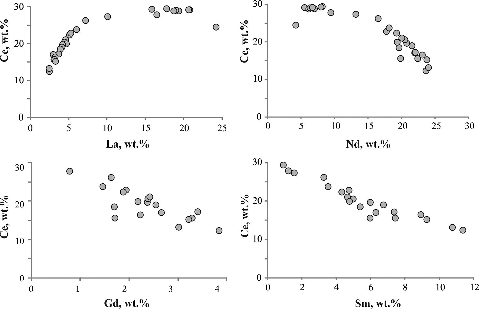 Внутреннее строение зерен имеет неоднородность, выраженную разницей в химическом составе центральной и краевой частей. Центральная часть более светлая и содержит наименьшее количество включений (рис. 4). Содержания Ce и La в центральной (светлой) части ниже, а Nd, Pr, Gd, Sm — выше (рис. 5). Отмечается положительная связь Ce и La, но отрицательная корелляция Се с Nd, Gd и Sm (рис. 6). Ранее А. Б. Макеев с коллегами в своей работе отмечали такую зависимость в куларите на Пижемском титановом месторождении (Макеев и др., 2020). По составу центральной части зерен выделяются Ce-Nd-монациты.