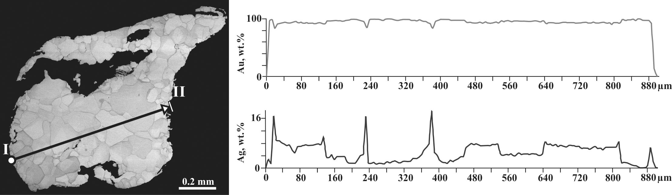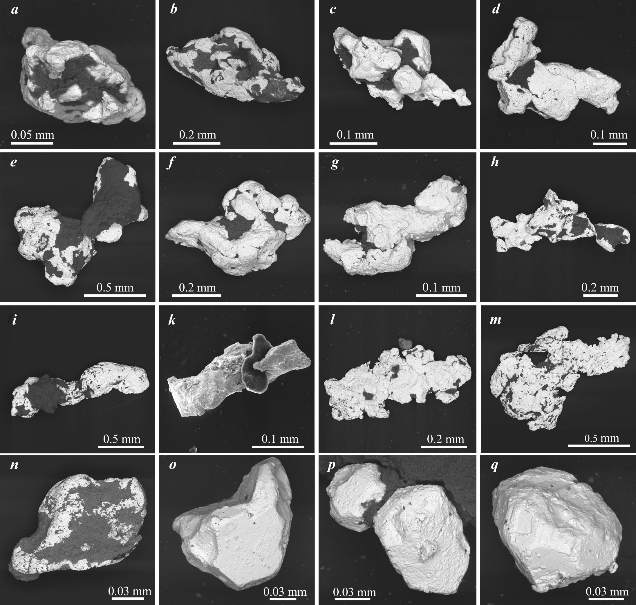 Золото соломенно-желтого цвета, неокатанное и слабой степени окатанности. Оно имеет рудный облик и широкое разнообразие форм — комковидное, сложное, стержневидное, таблитчатое, пластинчатое и гемидиоморфное (рис. 8). Для тонкого золота характерны зерновидные частицы кристалломорфной формы и тонкие пластинки. Более крупное золото размером более 0.5 мм имеет красновато-желтый цвет и слабую степень окатанности. Содержание серебра в золоте, определенное на поверхности частиц, варьирует от 0.55 до 19.2 мас. %.