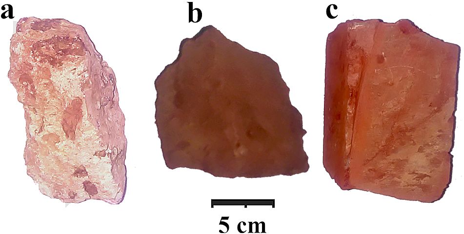 Cиаллиты и аллиты отчасти сохраняют плойчатую, слоистую текстуру материнских пород, также им присущи коломорфные, однородные и пятнистые текстуры (рис. 2, b, c). Породы преимущественно бурых, светло-бурых цветов с зеленоватым оттенком. Каолины изменяются от светло-серых, розовато-белых до красно-розовых, светло-бурых оттенков за счет примесных минералов железа (рис. 2, а). Структура пород мелкозернистая. Преобладание темноокрашенных разностей алюмосиликатного бесщелочного сырья связано с окислительными процессами и преобладанием трехвалентного железа в системе.